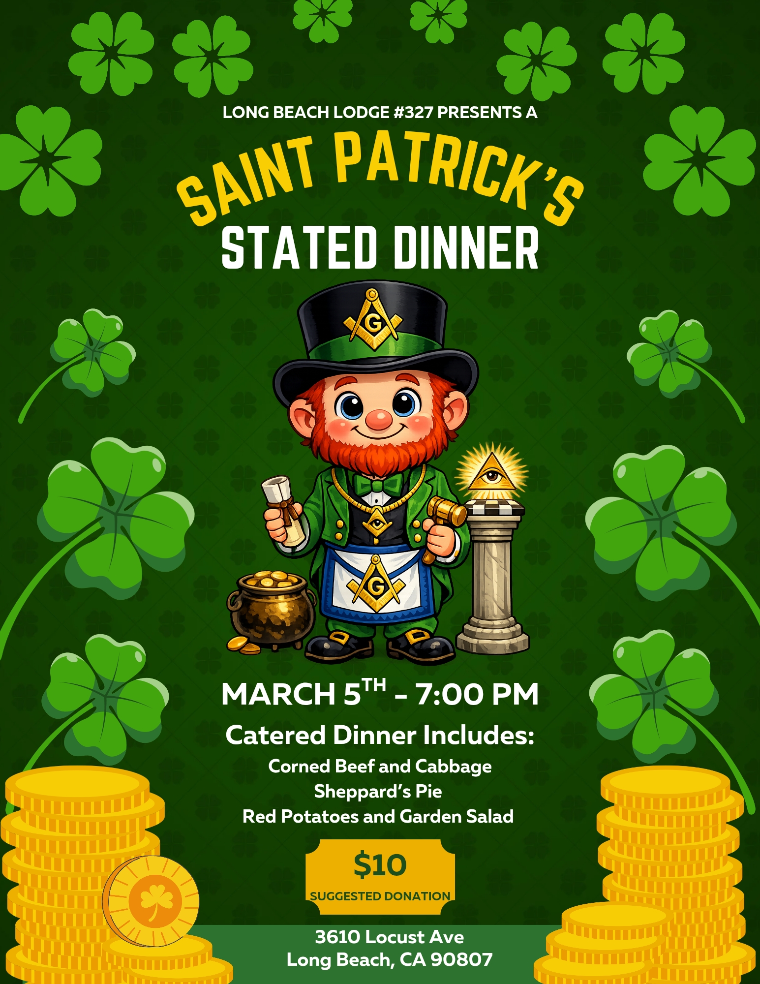 I would like to thank brother Marshall Goodman for giving me some guide lines for being Jr. Warden for such a large lodge as ours here in Long Beach. A very large thanks to Phebe Fricioni for being a power house of a helper and all those brothers and sisters who have assisted with cleaning and setup.